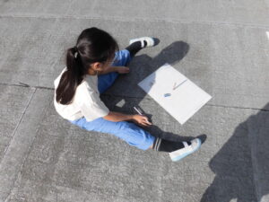 こちらは「太陽とかげ」の学習の様子です。朝と昼で、太陽の位置が変わっていることに遮光板を見て気付いたり、紙に映った鉛筆の影が短くなっていることを記録したりして、影ができる仕組みを明らかにしました。1学期から続けている、対話をしながら問題解決する学習を2学期も継続しています。