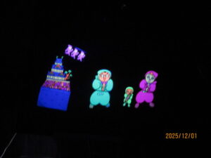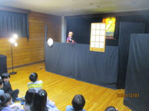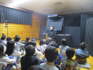 いつも朝の読み聞かせでお世話になっている「くるまざ」の皆さんによる、ロング読み聞かせがありました。素話やブラックライトシアター、人形劇とわくわくする内容でした。子供たちは驚いたり、笑ったりと、夢中になって楽しんでいました。