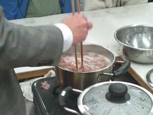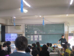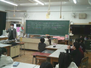 11月25日(火)に家庭科で出汁に関する授業を行いました。給食調理でお世話になっている食品加工会社の佐藤様を講師に招き、出汁に関する成分や歴史についてお話を聞きました。授業の最後には鰹のみの出汁と、鰹と昆布の合わせ出汁を試飲しました。子供たちは味や香りの違いに目を丸くしながら、興味深く学ぶことができました。