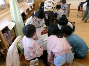 子供たちは、これまでに学習した「I’m 〜. I like 〜.」の表現を使って一人ずつ自己紹介したり、好きなものを伝え合ったりして、自分の話した英語が通じて嬉しそうでした。