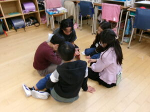 子供たちは、これまでに学習した「I’m 〜. I like 〜.」の表現を使って一人ずつ自己紹介したり、好きなものを伝え合ったりして、自分の話した英語が通じて嬉しそうでした。