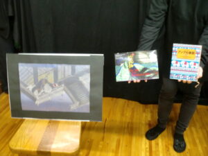 「素話『ドシュマンとドゥースト』」は、対象的な2人でしたが最後にはドゥーストの「善」が報われたというお話を、静かにろうそくが灯る中聞き入っていました。「手遊び」では、両手で行われているグリーンさんとメアリーさんの掛け合いを、聞いている側も思わず真似してしまうほどのめり込んでいました。3つ目の「影絵紙芝居『竹取物語』」では、切り絵と語りにより竹取物語の世界を演出していただきました。この切り絵はくるまざさんが制作したことを最後に知り、その精巧さに子供たちは驚いていました。