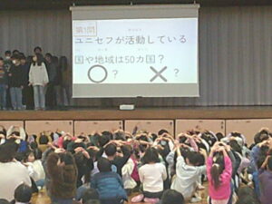 1月22日(木)にユニセフ集会を行いました。SDGs委員会の児童が1月23日(金)と27日(火)に行うユニセフ募金について、クイズを交えながら低学年にも分かるように伝えました。